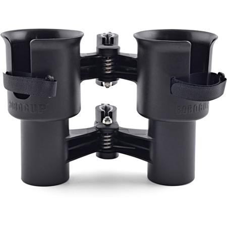 Prop 65 Warning CARoboCup portable caddy securely holds two drinks, two fishing poles, tools, gear and personal belongings including phone, GPS, keys, glasses, flashlight and much more. No tools are required: squeeze to open the wide rubberized jaws that operate with two powerful stainless steel springs. Includes two strong hook & loop straps with nylon buckles that can be inserted in various configurations to secure your gear. The bottom caps unscrew for easy cleaning and access for long objects including fishing poles.