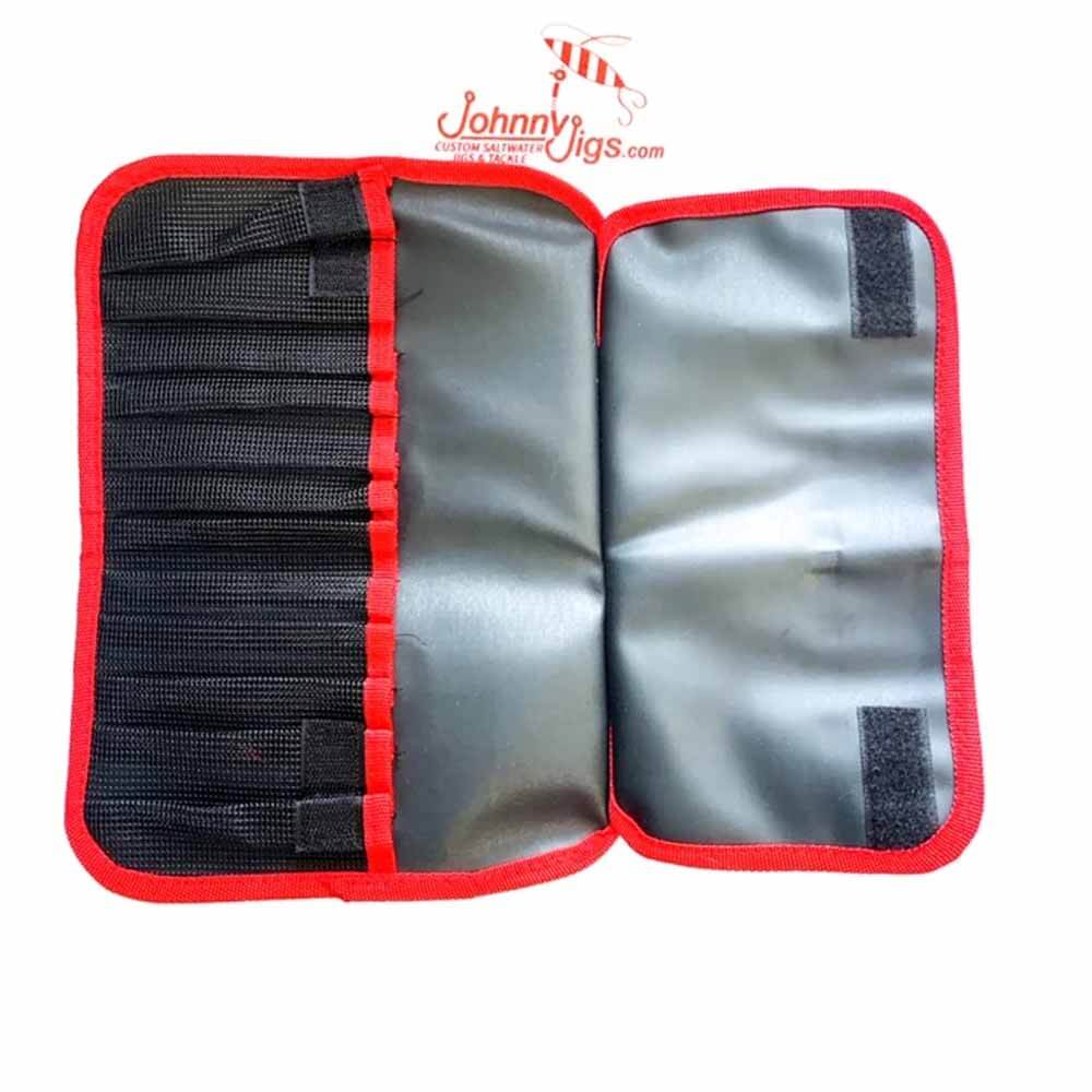 This Folding/Roll Up Slow Pitch Jig Pouch holds 12 Jigs up to 8" long and is an easy grab and go jig storage system. It can fold flat or roll up to carry on deck. Equipped with a velcro closure strap and a folding flap securing the jigs in their sleeves. The only limitation is that this pouch may not fit wider bodied jigs (approx. 2" wide),