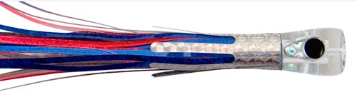 Prop 65 Warning CAThe C&H Alien Lure features a holographic eye,concave acrylic head and mylar skirt to provide a digging action. This leaves a large bubble trail, and can be trolled fast. Hook or bait slides up into the hollow head. Troll plain or with natural bait. 7 1/2".