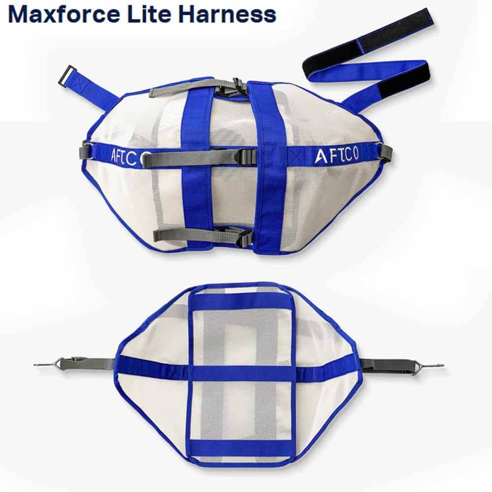 A new design added to the family of Maxforce harnesses. This lightweight yet durable harness is built with a vinyl mesh construction for breathability and support. A unique width adjustment allows this harness to fit most sizes. Also included is the Stainless Steel ladder lock system for increased durability. Comes with a Velcro strap and is best when fished with the Aftco Fighting belt L.